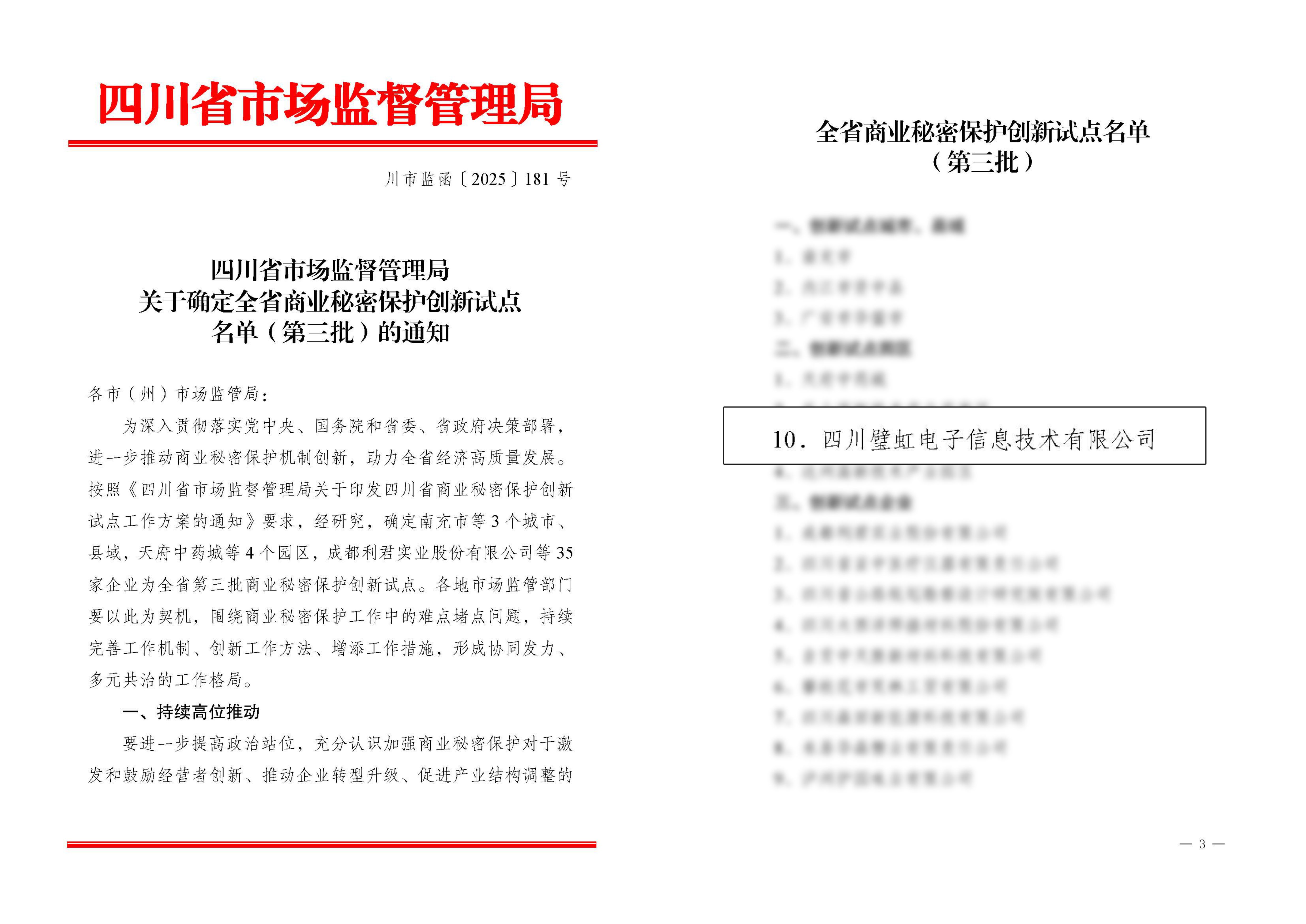 璧虹公司入选四川省第三批商业秘密保护创新试点名单